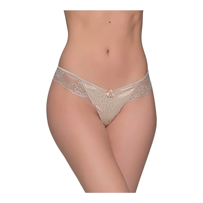 String από ύφασμα σατέν ζακάρ και ελαστική δαντέλα. Διακοσμημένο μπροστά με σατέν φιογκάκι και απλικέ αξεσουάρ με περλίτσα. Το αξεσουάρ μπορεί να φορεθεί και ως μενταγιόν. Με καβαλάκι από βαμβακερό ύφασμα εσωτερικά για καλύτερη υγιεινή προστασία. Σε απίθανη μπεζ απόχρωση που δεν διαγράφει μέσα από τα καλοκαιρινά σου ρούχα.