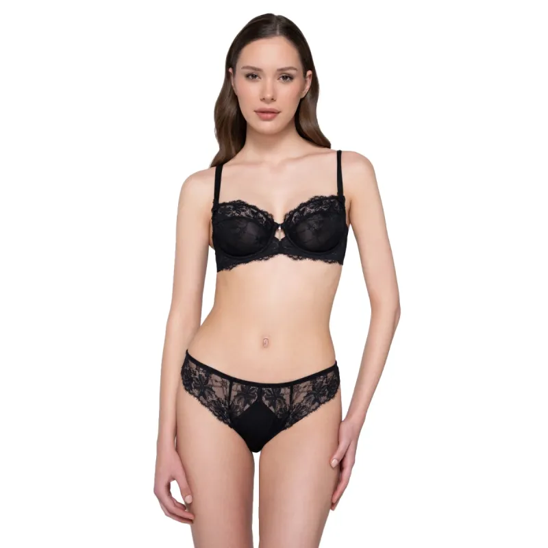 Σουτιέν Balconette με Δαντέλα σε Μαύρο - Αναδείξτε τη θηλυκότητά σας με αυτό το κομψό balconette σουτιέν σε μαύρο χρώμα. Διακοσμημένο με φίνα δαντέλα και διακριτικό άνοιγμα στο κέντρο, προσφέρει εκλεπτυσμένο στυλ και αισθησιακή εμφάνιση. Οι μπανέλες χαρίζουν στήριξη, ενώ η εφαρμογή του αγκαλιάζει το σώμα με άνεση. Ένα διαχρονικό κομμάτι που συνδυάζει κομψότητα και πρακτικότητα – ιδανικό για καθημερινή χρήση αλλά και για ιδιαίτερες στιγμές. Σύνθεση: 90% Πολυαμίδιο 10% Ελαστάνη