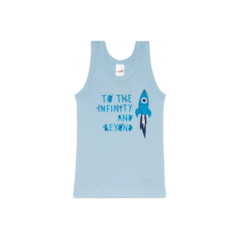 Μια παιχνιδιάρικη αμάνικη μπλούζα που προσκαλεί τους μικρούς εξερευνητές σε διαστημικές περιπέτειες. Ο χαριτωμένος πύραυλος και το μήνυμα “To the Infinity and Beyond” δημιουργούν μια ονειρική διάθεση γεμάτη φαντασία. Η απαλή γαλάζια απόχρωση δίνει δροσιά και άνεση για όλη τη μέρα. Ένα καλοκαιρινό κομμάτι που ταιριάζει απόλυτα σε αγόρια που αγαπούν το διάστημα και τα μεγάλα όνειρα.