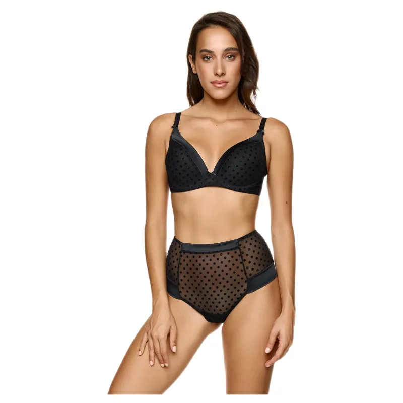 Κομψό γυναικείο σουτιέν με ενίσχυση και μπανέλα, σχεδιασμένο για άριστη στήριξη και όμορφο, φυσικό σχήμα. Το διάφανο πουά ύφασμα συνδυάζεται με σατέν λεπτομέρειες, δημιουργώντας ένα εκλεπτυσμένο και θηλυκό αποτέλεσμα. Οι ρυθμιζόμενες τιράντες προσφέρουν άνετη εφαρμογή και σταθερότητα, ενώ το διαχρονικό μαύρο χρώμα το καθιστά ιδανικό για κάθε περίσταση. Συνδυάζεται άψογα με brazil ή string της ίδιας σειράς.