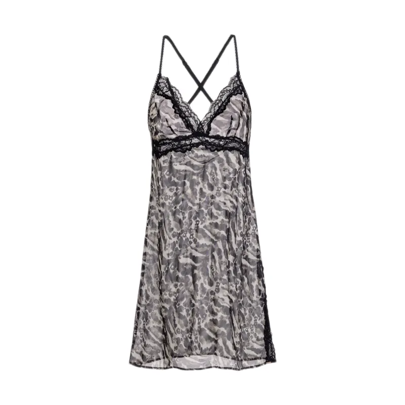 Κομψό και αισθησιακό γυναικείο σλιπ με μοντέρνο animal print σε αποχρώσεις του γκρι, διακοσμημένο με φίνα μαύρη δαντέλα. Προσφέρει άνετη εφαρμογή και θηλυκή γραμμή, συνδυάζοντας στυλ και καθημερινή άνεση. Ιδανικό για elegant εμφανίσεις και για να φορεθεί με το αντίστοιχο σετ.