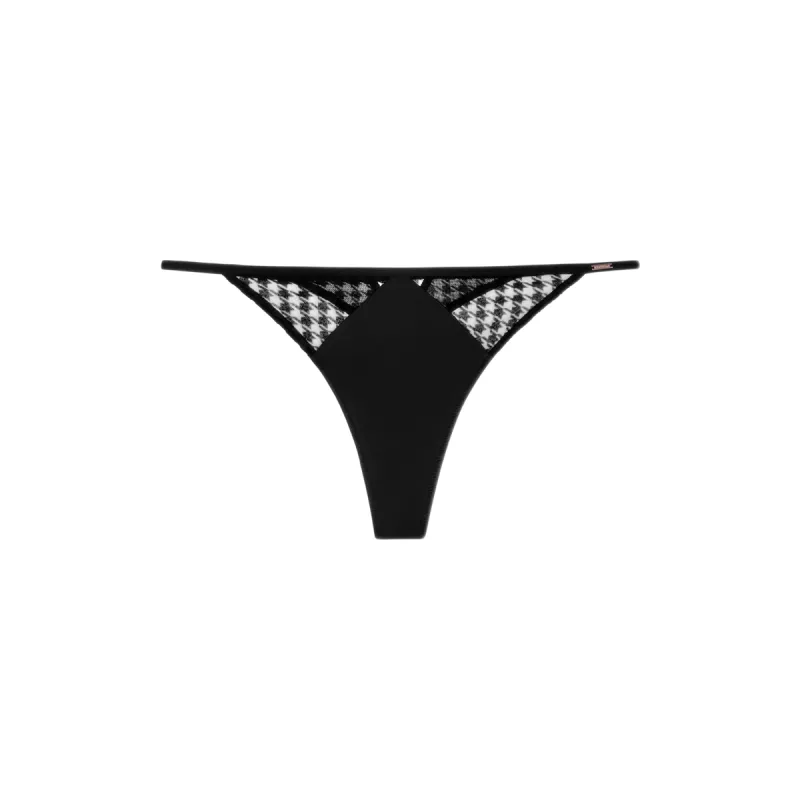 Κομψό και σύγχρονο γυναικείο στρινγκ σε μαύρο χρώμα, με διαφανές ύφασμα στα πλαϊνά και ιδιαίτερο γεωμετρικό μοτίβο που προσθέτει χαρακτήρα και δυναμικό στυλ. Το μπροστινό μέρος από απαλό, λείο ύφασμα προσφέρει άνεση, ενώ το minimal κόψιμο αγκαλιάζει τέλεια το σώμα. Ιδανικό για γυναίκες που αγαπούν το μοντέρνο lingerie look με διακριτική αισθησιακή διάθεση.