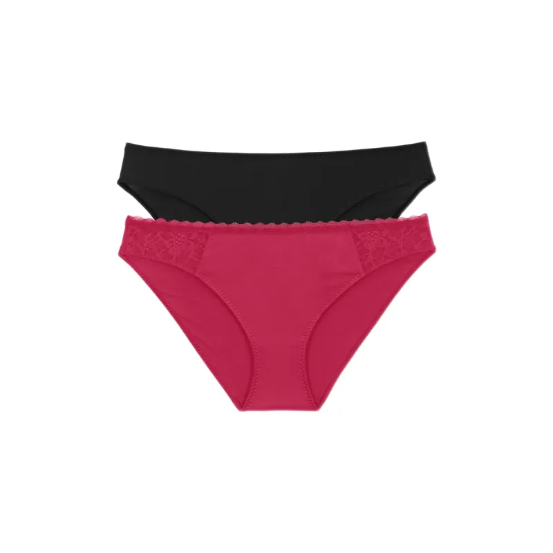 Κομψό και άνετο σετ γυναικείων σλιπ 2 τεμαχίων, σχεδιασμένο για καθημερινή χρήση με διακριτική θηλυκότητα. Το ένα σλιπ είναι μονόχρωμο μαύρο, ενώ το δεύτερο διαθέτει δαντελένιες λεπτομέρειες σε έντονο φούξια χρώμα, προσφέροντας στυλ και ποικιλία. Η απαλή υφή και η άνετη εφαρμογή εξασφαλίζουν άνεση όλη μέρα.