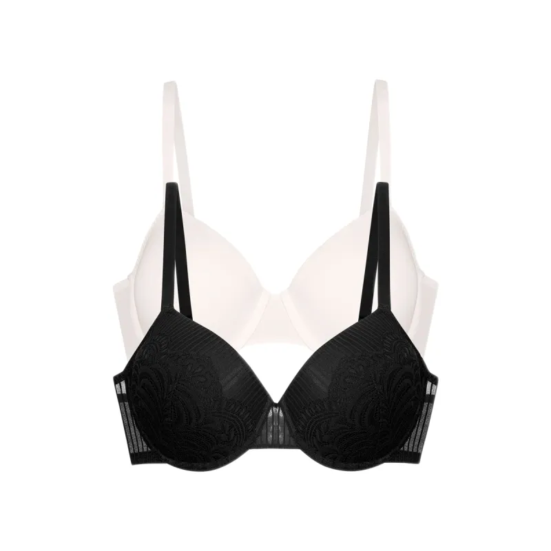 Κομψό και ευέλικτο σετ γυναικείων σουτιέν push-up, σχεδιασμένο για να καλύπτει κάθε ανάγκη. Το σετ περιλαμβάνει ένα μαύρο σουτιέν με ανάγλυφη δαντέλα και ένα λευκό λείο σουτιέν, ιδανικό για καθημερινή χρήση κάτω από ανοιχτόχρωμα ρούχα. Τα ενισχυμένα cups προσφέρουν όμορφη ανόρθωση και φυσικό ντεκολτέ, ενώ οι λεπτές ρυθμιζόμενες τιράντες εξασφαλίζουν άνεση και σωστή εφαρμογή.