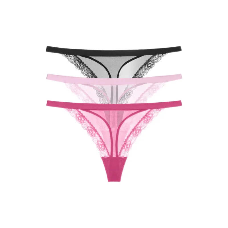 Κομψό και αισθησιακό σετ γυναικείων στρινγκ 3 τεμαχίων, σχεδιασμένο για άνεση και θηλυκή εμφάνιση. Τα στρινγκ διαθέτουν διάφανη mesh υφή με λεπτές δαντελένιες λεπτομέρειες στα πλαϊνά, προσφέροντας ανάλαφρη αίσθηση και διακριτική κομψότητα. Η minimal γραμμή εξασφαλίζει τέλεια εφαρμογή χωρίς να διαγράφει κάτω από τα ρούχα, ιδανική για καθημερινή αλλά και ιδιαίτερη χρήση.