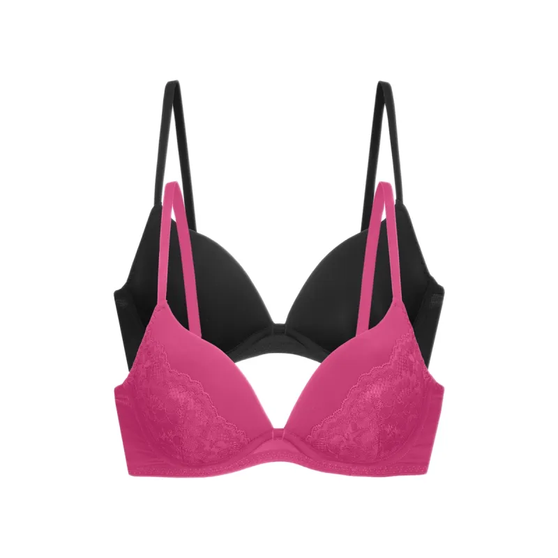 Θηλυκό και μοντέρνο σετ γυναικείων σουτιέν push-up 2 τεμαχίων, που συνδυάζει άνεση και εντυπωσιακό αποτέλεσμα. Το σετ περιλαμβάνει ένα κλασικό μαύρο σουτιέν με λεία υφή και ένα φούξια σουτιέν με κομψές δαντελένιες λεπτομέρειες στα cups. Τα ενισχυμένα push-up cups προσφέρουν φυσική ανόρθωση και όμορφο ντεκολτέ, ενώ οι ρυθμιζόμενες τιράντες εξασφαλίζουν σταθερή και άνετη εφαρμογή όλη την ημέρα.