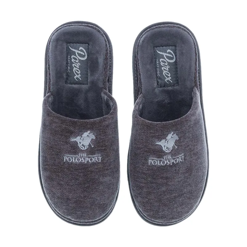Άνετες και πρακτικές ανδρικές παντόφλες σπιτιού με κλειστό μπροστινό μέρος και απαλή υφή. Ιδανικές για καθημερινή χρήση στο σπίτι, προσφέρουν ζεστασιά και σταθερό πάτημα, ενώ το γκρι χρώμα και το διακριτικό λογότυπο χαρίζουν κλασικό στυλ.
