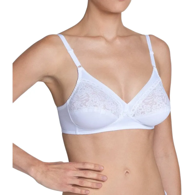 Κομψό και άνετο γυναικείο σουτιέν χωρίς μπανέλα, ιδανικό για καθημερινή χρήση. Ο συνδυασμός λείας ενίσχυσης στο κάτω μέρος και διακριτικής δαντέλας στο επάνω μέρος προσφέρει φυσική στήριξη και θηλυκή εμφάνιση. Οι ρυθμιζόμενες τιράντες εξασφαλίζουν σωστή εφαρμογή, ενώ το απαλό ύφασμα αγκαλιάζει το στήθος χωρίς να πιέζει. Το λευκό χρώμα το καθιστά ιδανικό για ανοιχτόχρωμα ρούχα και για all-day άνεση.