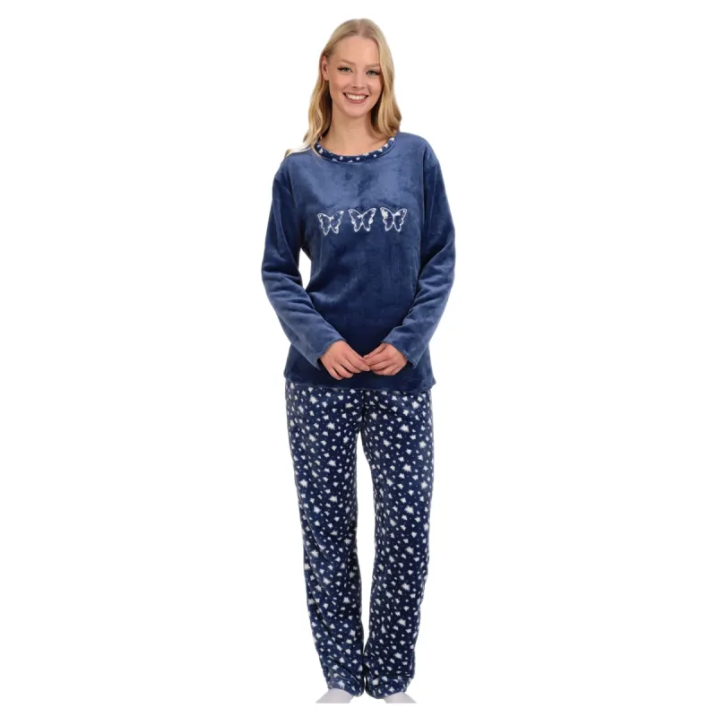 Ζεστή και ιδιαίτερα απαλή γυναικεία πυτζάμα από fleece ύφασμα, ιδανική για τους χειμερινούς μήνες. Η μπλούζα διαθέτει μακριά μανίκια, στρογγυλή λαιμόκοψη και διακοσμητικό τύπωμα με πεταλούδες στο στήθος, προσφέροντας θηλυκό και κομψό ύφος. Το παντελόνι με all over μοτίβο ολοκληρώνει το σετ, εξασφαλίζοντας άνεση και χαλαρή εφαρμογή για ξεκούραστο ύπνο και cozy στιγμές στο σπίτι.