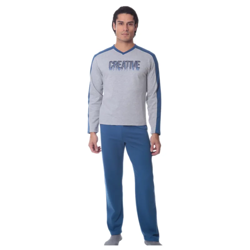 Ανδρική πυτζάμα σε κομψό συνδυασμό γκρι και μπλε αποχρώσεων, ιδανική για άνετη καθημερινή χρήση στο σπίτι. Η μπλούζα διαθέτει V λαιμόκοψη και μοντέρνα στάμπα- λόγκο Creative στο στήθος, με μπλε λεπτομέρειες στα μανίκια που προσθέτουν δυναμικό χαρακτήρα. Το μονόχρωμο μπλε παντελόνι προσφέρει άνετη εφαρμογή και ολοκληρώνει το σύνολο με minimal αισθητική. Κατάλληλη για φθινόπωρο και χειμώνα.