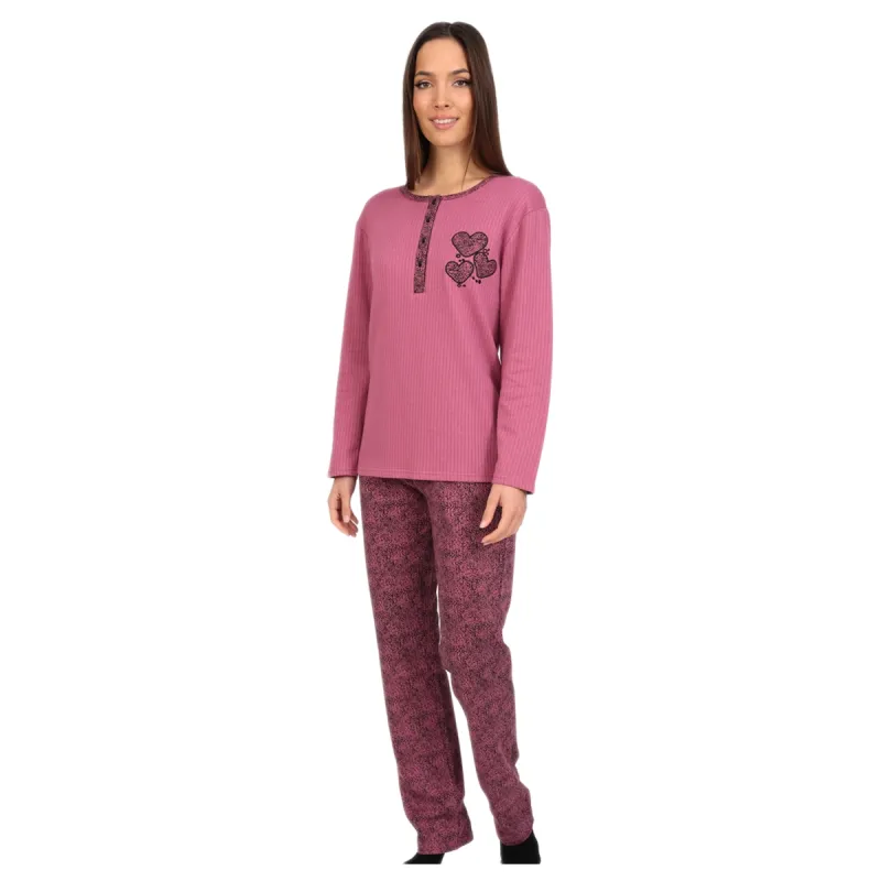 Γυναικεία πυτζάμα από απαλό rib ύφασμα σε ροζ απόχρωση, ιδανική για άνεση και ζεστασιά. Η μπλούζα με μακριά μανίκια διαθέτει πατιλέ με διακοσμητικό σχέδιο καρδιές στο στήθος, προσδίδοντας ρομαντικό χαρακτήρα. Το παντελόνι με all-over μοτίβο σε τόνους ροζ ολοκληρώνει το σετ με άνετη εφαρμογή, κατάλληλη για ύπνο και χαλάρωση στο σπίτι.