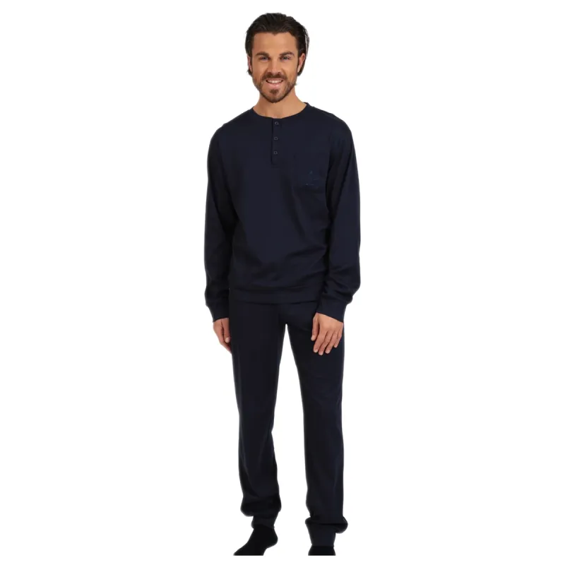 Κλασική και άνετη ανδρική πυτζάμα σε σκούρο μπλε χρώμα. Αποτελείται από μονόχρωμη μπλούζα με μακριά μανίκια, πατιλέτα με κουμπιά και διακριτική τσέπη στο στήθος, συνδυασμένη με αντίστοιχο μονόχρωμο παντελόνι. Κατασκευασμένη από απαλό και ποιοτικό ύφασμα, προσφέρει άνεση και σταθερή εφαρμογή, ιδανική για ύπνο αλλά και για χαλαρή χρήση στο σπίτι.