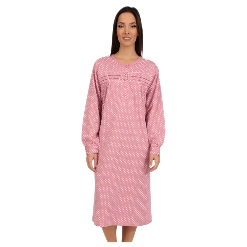 Γυναικείο νυχτικό σε απαλό ροζ χρώμα με διακριτικό λευκό πουά μοτίβο. Διαθέτει στρογγυλή λαιμόκοψη με πατιλέτα και κουμπιά, καθώς και διακοσμητικές πιέτες στο στήθος που προσθέτουν κομψότητα και άνεση στην εφαρμογή. Τα μακριά μανίκια και το μήκος μέχρι το γόνατο το καθιστούν ιδανικό για άνετο και ζεστό ύπνο, αλλά και για χαλαρές στιγμές στο σπίτι.