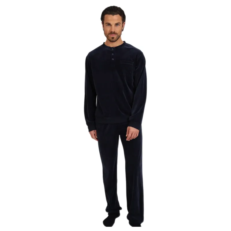 Ανδρική βελούδινη πυτζάμα δύο τεμαχίων, ιδανική για τις κρύες ημέρες του χειμώνα. Η μακρυμάνικη μπλούζα διαθέτει στρογγυλή λαιμόκοψη με κουμπιά και πρακτική τσέπη στο στήθος, προσφέροντας κλασικό και διαχρονικό στυλ. Το βελούδινο παντελόνι εξασφαλίζει απαλή αίσθηση, ζεστασιά και άνετη εφαρμογή. Ιδανική επιλογή για ύπνο αλλά και άνετη παραμονή στο σπίτι.