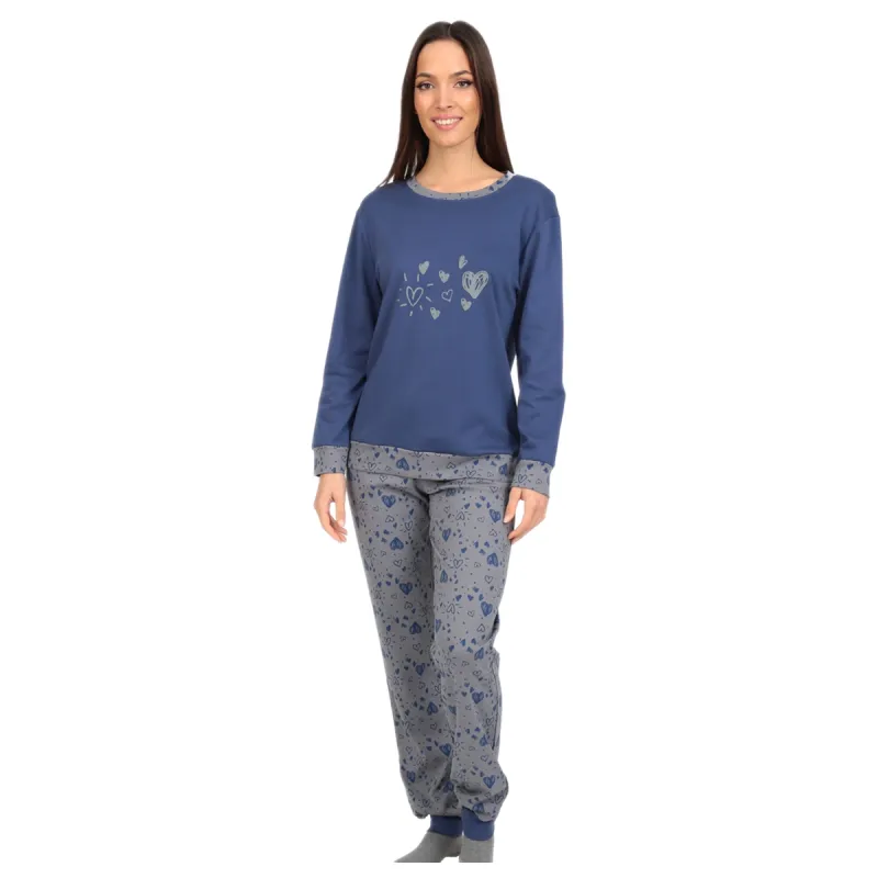 Άνετη και κομψή γυναικεία πυτζάμα δύο τεμαχίων, ιδανική για χαλάρωση στο σπίτι και ποιοτικό ύπνο. Η μακρυμάνικη μπλούζα σε μπλε απόχρωση διαθέτει διακριτικό σχέδιο με καρδιές στο μπροστινό μέρος, προσφέροντας θηλυκή και μοντέρνα αισθητική. Το γκρι παντελόνι με all-over μοτίβο καρδιές συνδυάζει στυλ και άνεση, ενώ η χαλαρή γραμμή εξασφαλίζει ευχάριστη εφαρμογή και ελευθερία κινήσεων. Ένα σύνολο που φοριέται άνετα όλη την ημέρα, όχι μόνο για ύπνο αλλά και ως homewear.