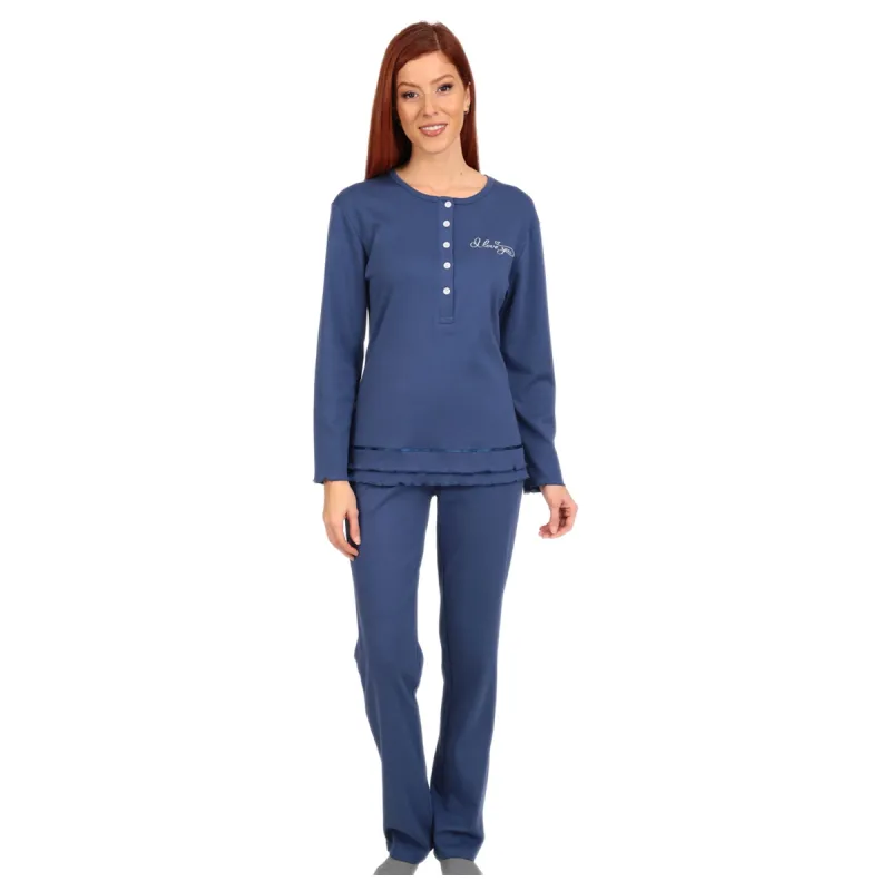 Κομψή και άνετη γυναικεία πυτζάμα σε μονόχρωμη μπλε απόχρωση, ιδανική για άνετο ύπνο και χαλαρές στιγμές στο σπίτι. Η μπλούζα διαθέτει μακρύ μανίκι, κουμπιά στο ντεκολτέ και διακριτικό κέντημα στο στήθος, προσφέροντας ένα minimal και θηλυκό στυλ. Το παντελόνι σε ίσια γραμμή εξασφαλίζει άνετη εφαρμογή και ελευθερία κινήσεων. Κατασκευασμένη από απαλό και ευχάριστο ύφασμα, αποτελεί ιδανική επιλογή για τους φθινοπωρινούς και χειμερινούς μήνες.