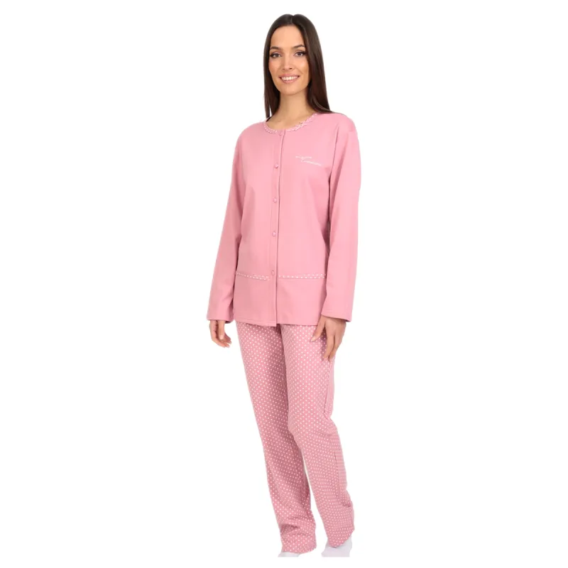Κομψή και άνετη γυναικεία κουμπωτή πυτζάμα, ιδανική για ξεκούραστο ύπνο και χαλαρές στιγμές στο σπίτι. Το σετ αποτελείται από μπλούζα με μακρύ μανίκι και κουμπιά σε απαλό ροζ χρώμα, με διακριτικές λεπτομέρειες και τσέπες, συνδυασμένη με παντελόνι σε πουά μοτίβο για μια γλυκιά και θηλυκή εμφάνιση. Κατασκευασμένη από μαλακό βαμβακερό ύφασμα, προσφέρει άνετη εφαρμογή και ευχάριστη αίσθηση στο δέρμα, ενώ το κουμπωτό σχέδιο την καθιστά πρακτική και ιδανική και για homewear.