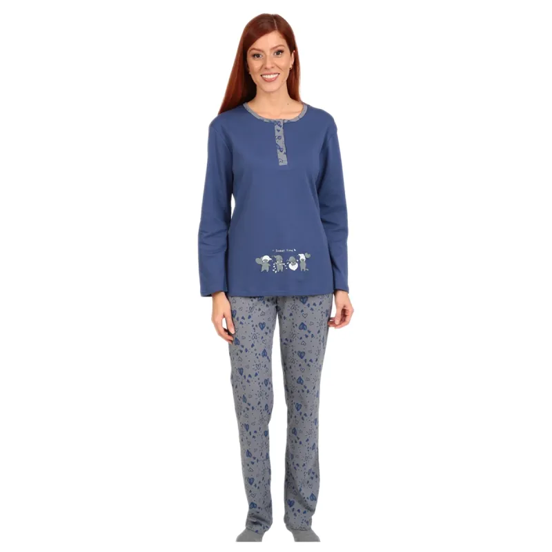 Stylish and comfortable women’s pyjama set, perfect for restful nights and cozy moments at home. The set includes a long-sleeve blue top with a buttoned neckline and a subtle “Sweet Time” front print, paired with grey pants featuring an all-over pattern. Made from soft and breathable cotton fabric, it offers excellent comfort, a pleasant feel on the skin and freedom of movement. An ideal choice for sleeping or lounging at home.